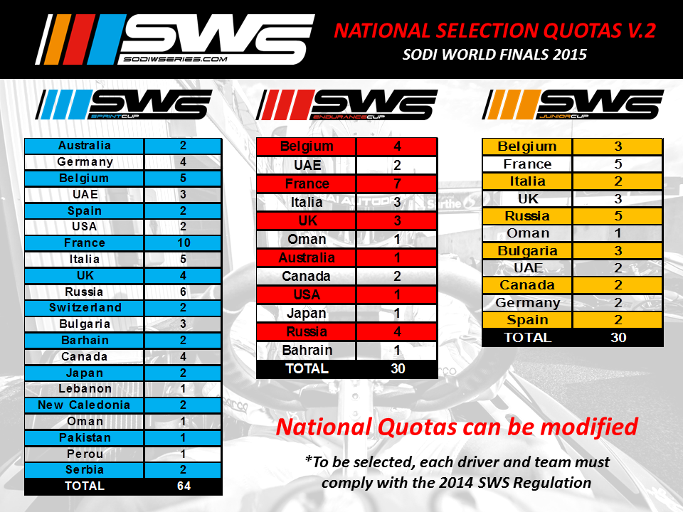 Please find below the table of the National Quotas selection. 21 countries will be represented! Do not hesitate to check the SWS 2014 regulation to discover all means of selections (International, national, per age, per gender,....)